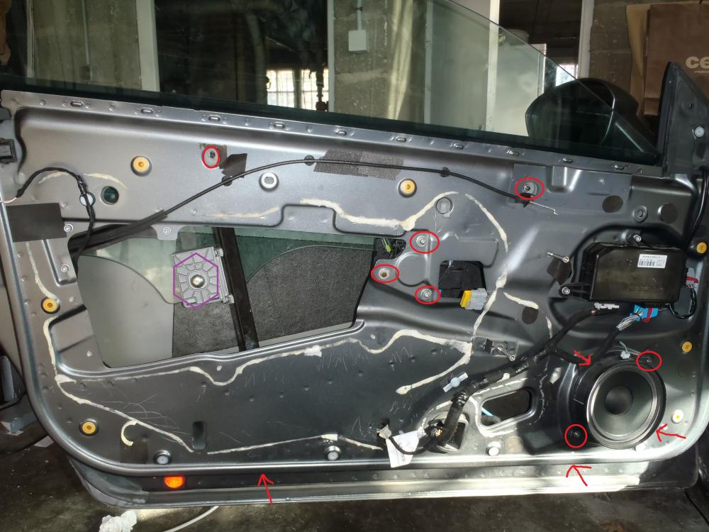 Outillage : un tournevis cruciforme , clés Allen de 5 , Clés torx 27 , clés à pipe de 10 percée. Flèche rouge : tournevis cruciforme , une vis est derrière le cache en haut à gauche. Rond jaunes : clé allen de 5 , une est derriere un cache , derrière la poignée d'ouverture Dégraffer l'intérieur de porte, il y a 7 agrafes ( en jaune sur la photo ) et le sortir par le haut , il faut forcer un peu. Débrancher la commande lève vitre , la poignée d'ouverture de porte, l'éclairage de bas de porte et en haut à gauche le fil du ?? ( centralisation ? ) Enlever la protection qui est collée . Ensuite sortir le haut parleur ,tournevis cruciforme pour acceder à la 2ème fixation de la vitre Dévisser la fixation de la vitre à gauche et ensuite celle de droite( soutenez la vitre ) Sortez la vitre. Ensuite dévissez le moteur( 3 vis torx T27 ) puis le mécanisme, 2 écrous de 10 en haut et 2 sous la portière ( clé à pipe de 10 percée ) ou il y a des caches en caoutchouc . Et voilà c'est fait Pour le remontage et bien c'est l'inverse ... Avant de remonter la garniture de porte faites des essais de fermeture de porte et de vitre . Si je ne suis pas assez clair ,il faut me le dire ,merci.