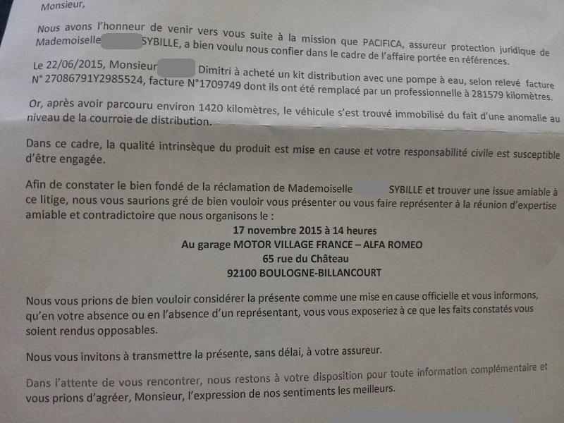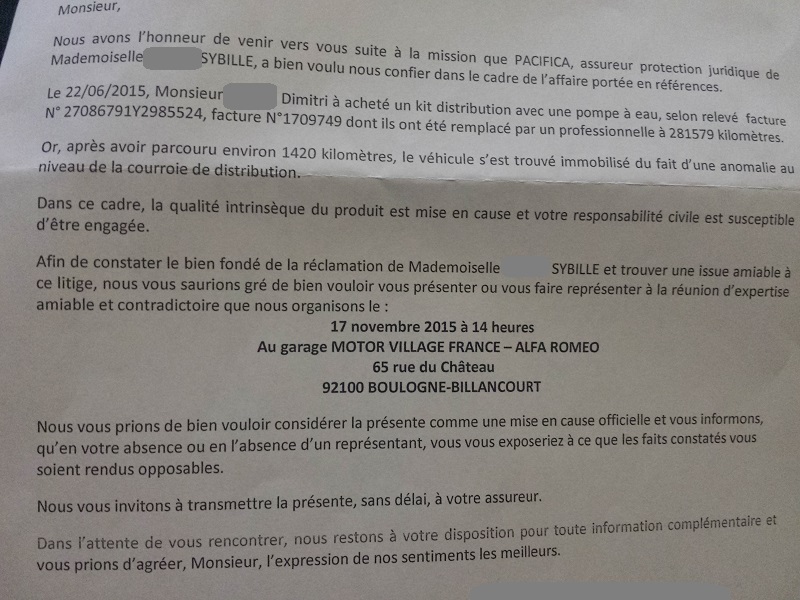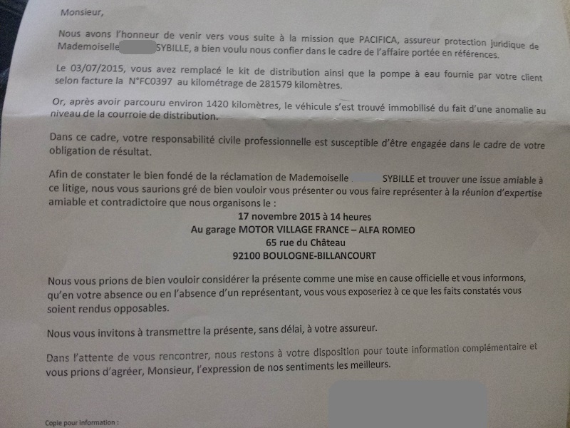 Bonsoir, ok merci je rincerais tout avec un tuyau d'eau quand le problème sera résolu. Sinon j'ai reçu une lettre de l'expert et l'expertise se fera le 17 Novembre : La lettre envoyé a Yakarouler : Et celle du mécanicien : Encore 1 mois a attendre, mais bon pas le choix ... -