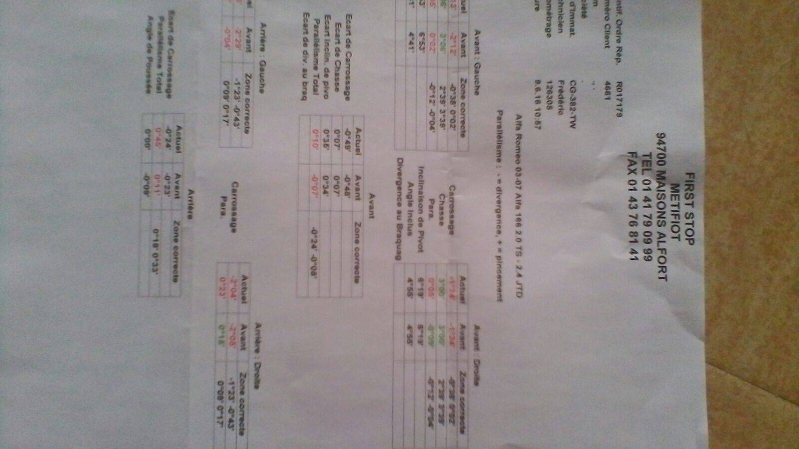 Du coup repassage en geometrie... il m'a fait un prix mais pas gratuit quand meme.... Le berceau n'a pas trop bouge. Il a juste recule et a repris un peu de chasse. Du coup il m'a remis du pincement a l'avant (contre de l'ouverture preco alfa) Et a l'arriere (un peu trop) Ca devrait limiter l'usure des pneus en tout cas. Je verrai pour enlever u. Peu de pincement a l'arriere car il a ete un Peu loin
