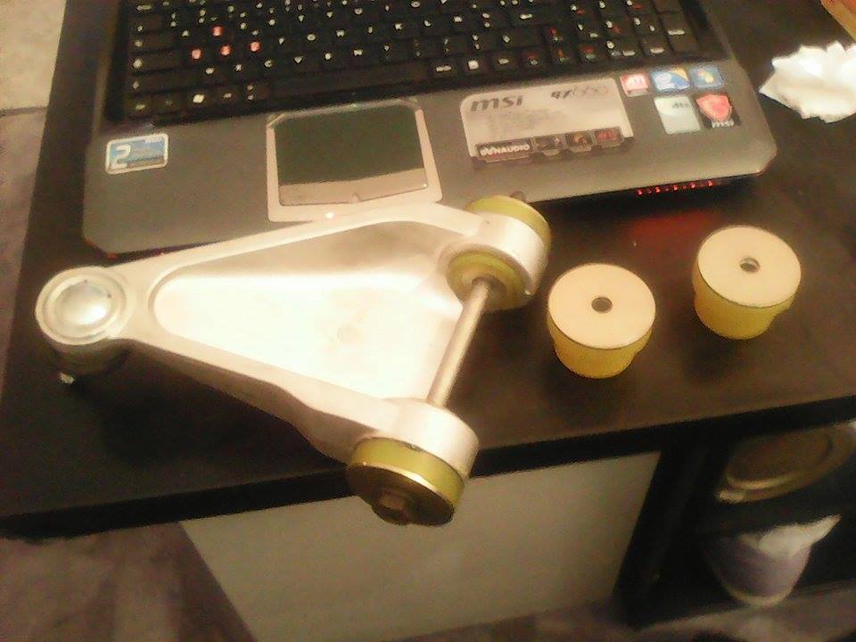 Plaquettes avant neuve, j'en est profité pour faire mes centre de disque... Comme a l'arrière. Puis, montage de mes triangles équipé du kit silentbloc Strongflex. J'ai choisi des jaune, parce que contrairement a d'autre auto sur les qu'elles ont peut équipé un train avant complet, sur la 166 ont ne trouve que les sb de triangle sup et les sb de barre stab pour l'avant, donc je me suis dis que ça ne sera pas trop dur. Le comportement routier a encore évolué, le train avant est plus vif et gagne encore en précision. Je trouve qu'elle est légèrement plus dur, je ressent beaucoup plus les petits défaut de la route. Ma femme me dit ne pas ressentir de grosse différence, ce qui est plutôt intéressent. -