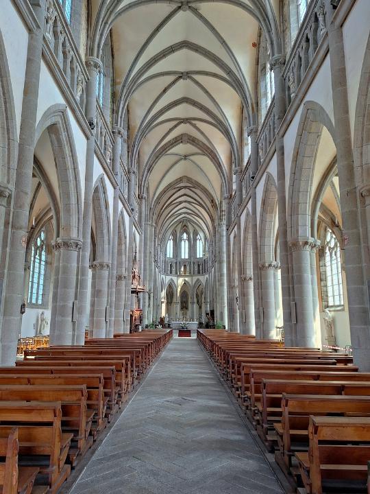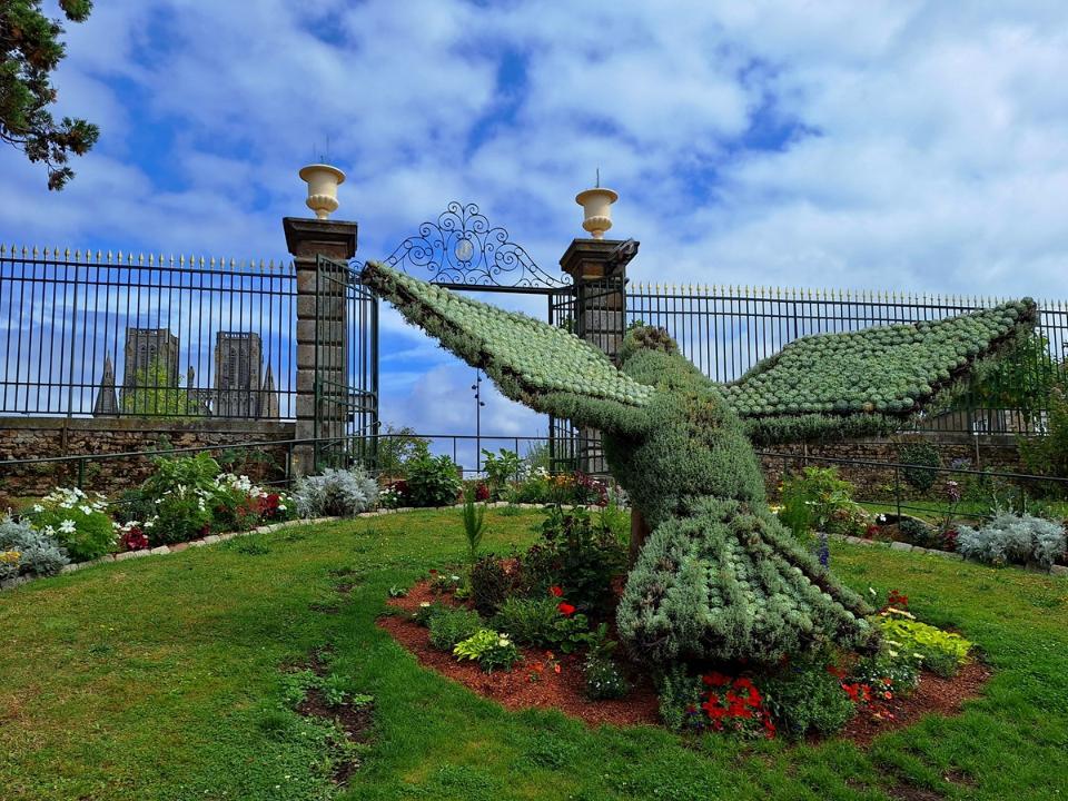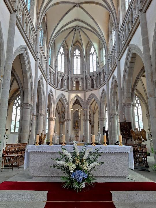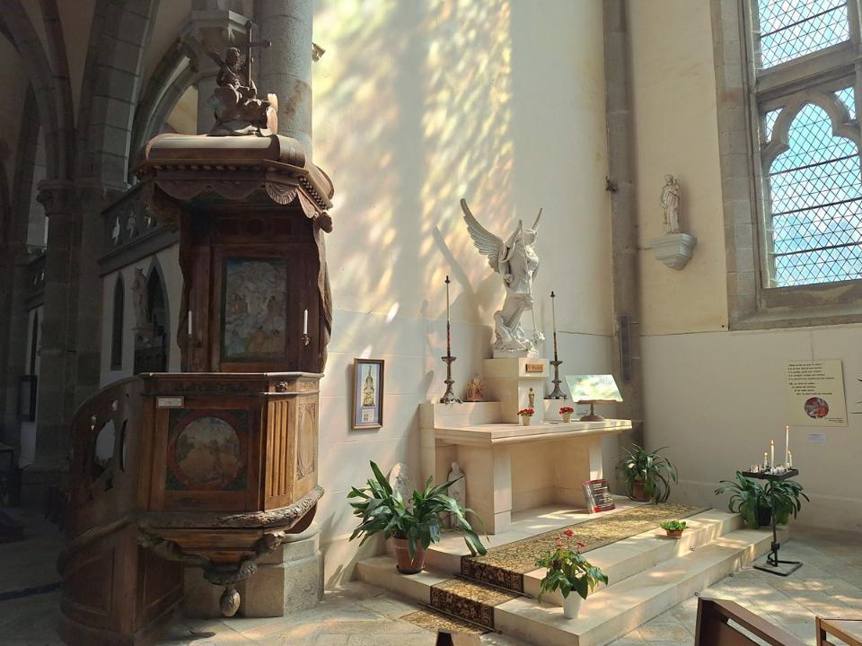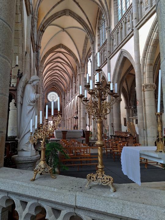 On continu notre balade par l'église Saint Saturnin que l'on ne fait que longer pour aller à l'église Notre Dame des Champs Si la première église date de la fin du XIIème siècle, début du XIIIème siècle, c'est en 1863 qu'elle est considérablement agrandie pour palier à la destruction de la Cathédrale. Elle ne fut finie qu'en 1937 suite à la première guerre mondiale. Elle fut malheureusement gravement endommagée lors des bombardements du 8 et 9 juin 1944, mais reconstruite à l'identique et rouverte en février 1962. Allez on entre Linteau repris de l'ancienne église et Vierge à l'Enfant en bronze doré datant du XIXème Les vitraux qui avaient été démontés avant la guerre date de l'agrandissement La très belle chair de l'ancienne église datant du XVIIIème siècle En face de l'église Notre Dame des Champs se trouve le très beau jardin des plantes C'est l'ancien jardin nourricier du couvent des moines Capucins (1618). Après la révolution, il est donné à l'école centrale du département pour la mise en pratique des cours, puis transformé en jardin botanique, puis transformé en jardin d'agrément. Le jardin des plantes d'Avranges inspire Victor Hugo (1836), Stendhal (1837), Paul Féval (La Fée des grèves, 1850) et Guy de Maupassant (Le Horla, 1886). Il offre une très belle vue sur la baie du Mont Saint Michel Voila notre voyage en Bretagne et Normandie est terminé. Les villes de Fougères et d'Avranches méritent vraiment une visite... Lodein -