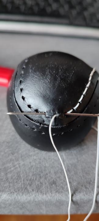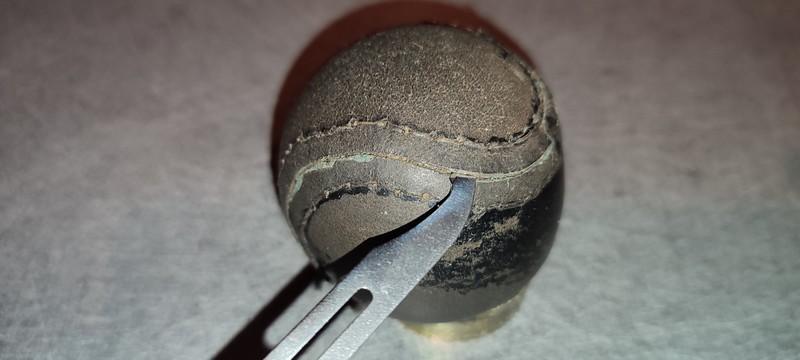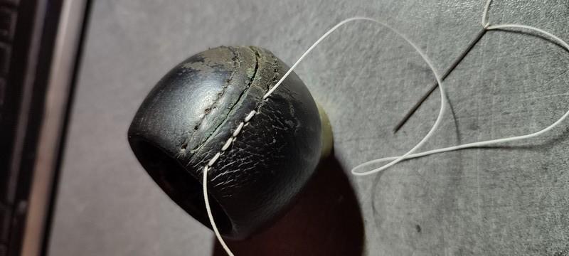 Petit déterrage de presque 3 ans . . . En photo la remise en état vite fait d'un pommeau de 156 Tout d'abord le pommeau bien abimé Ensuite on prend une belle lame de scalpel courbe pour décoller et couper la couture d'origine On se retrouve avec ça un fois terminé Il faut bien retirer le restant du fil avec une petite pince très fine ( ou une pince à épiler , attention à la remettre en place sous peine de tirage d'oreille par madame 😉) Vous pouvez aussi en profiter pour bien marquer les trous déjà existants . Une fois que la couture à disparue , on fait un petit essai , pas besoin de 3 mètres de fil ,on regarde juste si ça passe bien . Je passe sur la remise en état du cuir du pommeau et on va directement à la nouvelle couture . Pour faire simple , on passe l'aiguille dans le trou précédent et on la ressort par le trou d'après , ça permet de faire une boucle . Prévoir assez de fil , environ 2 mètres pour ne pas devoir faire un raccord au milieu , moi j'ai choisi un fil blanc de 0.6mm très costaud A la fin on stop le fil par une boucle à la base du pommeau . Une arrivé ici il reste juste à recoller les bords ( voir les flèches vertes ) et c'est fini ,vous avez un pommeau tout neuf . A bientôt !!