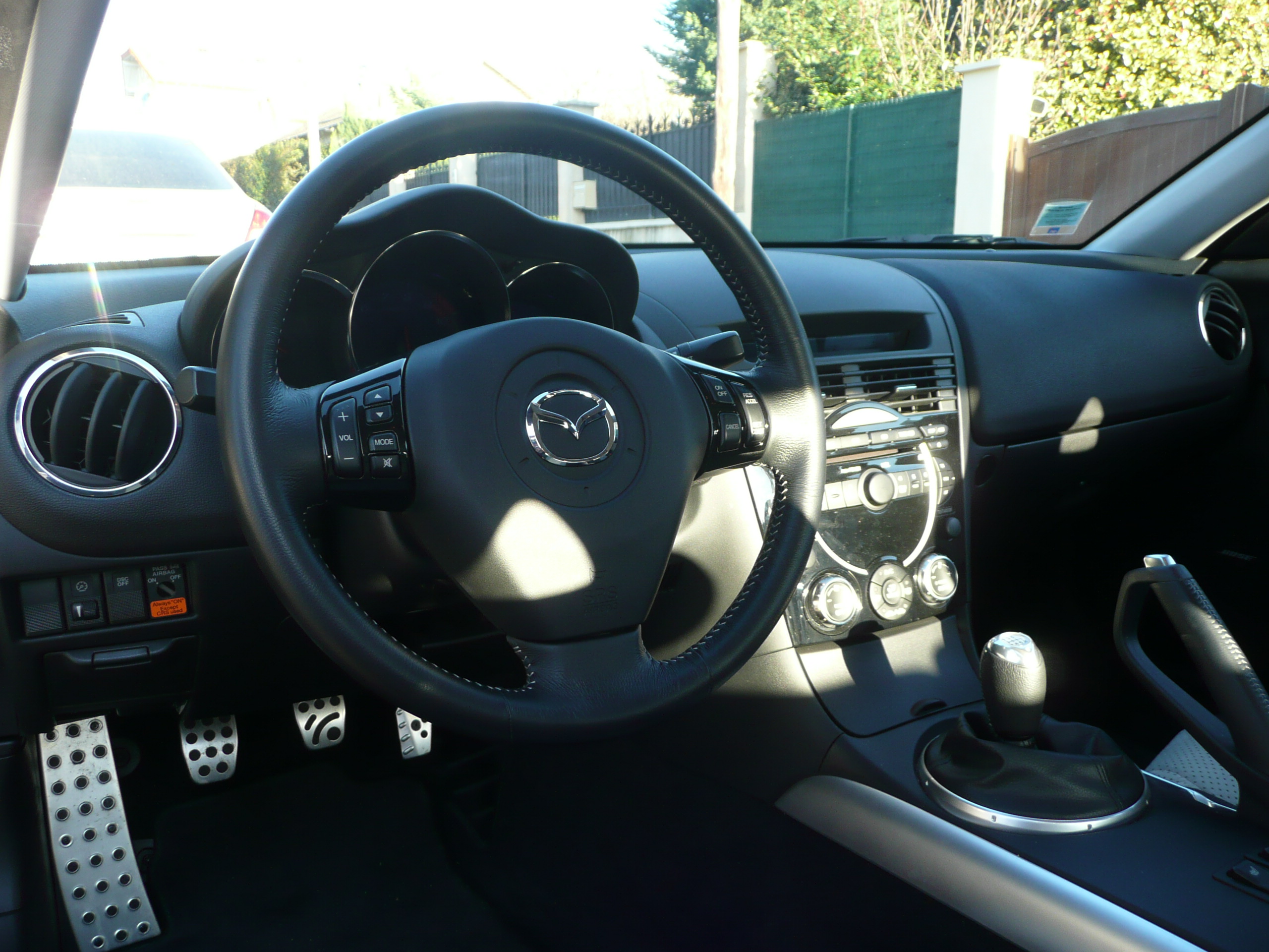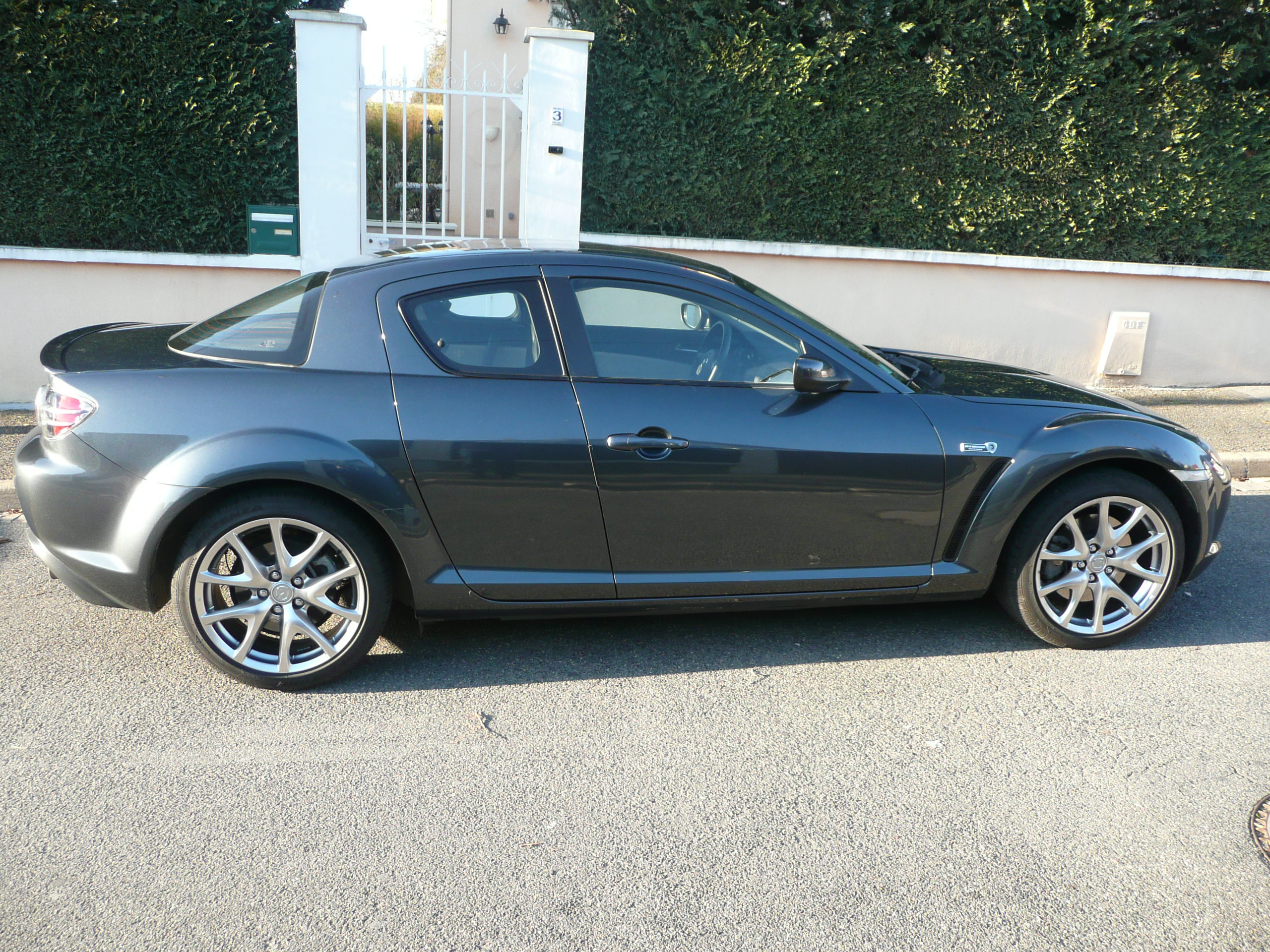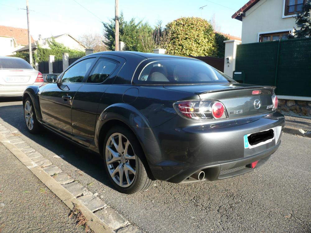 Seconde partie: Les Ex - Le souvenir, c'est la presence invisible... Les voitures japonnaises n'ont jamais vraiment ete ma tasse de sake. Il me faut de l'orginal, pas forcement du meilleur, mais du "different", or le design nippon me semble le plus souvent manquer d'originalite, les interieurs sont tristes, les mecaniques sont sans saveur etc... Bref ces types sont les allemands de l'orient Bien sur tout ca ce sont des generalites (totalement subjectives comme d'habitude, y'en a plein qui pensent differemment et ils ont autant raison que moi) et quelques modeles font exception. Le developpement du moteur a piston rotatif par le Dr Wankel date des annees 50, et NSU sera le premier constructeur vendre une voiture equipee de cette techno. Tres vite, afin d'amortir les frais de developpement, il vendront le brevet a d'autres constructeurs: Citroen, Suzuki, Mercedes et surtout... Mazda! Vous avez tous entendu parler des deboires de ces engins: conso elevee, duree de vie limitee... des les 70s chacun se rend a l'evidence et range au placard les pistons rotatifs. Mais chez Mazda on est du genre obstine, et la gamme comprendra 1 ou plusieurs rotatifs au catalogue de 1967 a 2012 (encore une époque revolue donc...) Moi, les desperados qui veulent a tout prix avoir raison contre tout le monde, ca me plait :) Surtout que dans le monde industriel d'aujourd'hui, bien peu ont encore le cran de prendre de tels risques. Et puis au dela de leurs inconvenients bien connus, les rotatifs ont aussi de beaux avantages: rapports puissance/poids 2 fois plus eleve que pour un moteur conventionnel, quasi absence de vibrations, capacite a atteindre des regimes inaccessibles a une mecanique bielle-manivelle, sonorite de turbine unique... Aussi quand en 2003 Mazda sort son dernier ovni (la RX8), je lui fais les yeux de Chimene Je trouve la voiture superbe, c'est une 4 places (usage familial limite mais possible avec des enfants) et en plus de son moteur elle propose quelques singularites tres interessantes comme l'absence de pied milieu et les portes a ouverture antagoniste. Y'a pas a dire, dans la production neuve et accessible de l'epoque, c'est la seule qui pouvait me faire craquer! Oui mais voila, la belle n'est tout de meme pas donnee, je venais juste d'acquerir ma residence principale, il y avait d'autres priorites... Les annees passent, d'autres autos se succedent au garage, je n'y pense plus vraiment jusqu'a ce jour de 2008 ou au detour d'une revue, j'apprends par hasard que Mazda s'apprete a sortir une serie limite de la RX8 qui marquera a la fois le 40e anniversaire du rotatif... et la fin de commercialisation du modele en France (les version "facelift" de 2009 n'etant pas prevues pour la vente). Arg, gros pincement au coeur: bientot y'en aura plus!!! Apres renseignement, il semble que Mazda ait du mal a ecouler ce modele et propose de monstrueuses promos, l'excuse revee pour finir de me convaincre! Apres quelques visites chez Mazda Austerlitz a Paris (dont une memorable avec madame venue verifier que la poussette rentrait bien dans le coffre!), je signais un bon de commande de 26500 euros (CG et malus ecologiques compris) et repartais au volant d'une 40th anniversary. C'etait le 5 decembre 2008 et a ce jour ca reste la seule voiture neuve que j'ai jamais possedee... La suite en image: La couleur, les jantes, les badges sont specifiques La suspension Bilstein est egalement specifique au modele, l'auto est legerement surbaissee Les portes antagonistes sans pied milieu. A l'interieur le cuir/alcantara differencie les 40th anniversary des autres RX8 Le cockpit est totalement stock. Remarquez le levier de vitesse riquiqui, ca promet du debattement super-court!