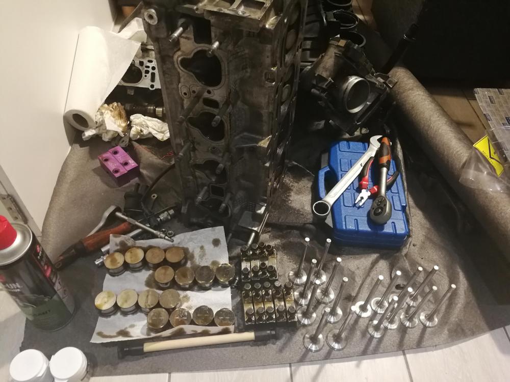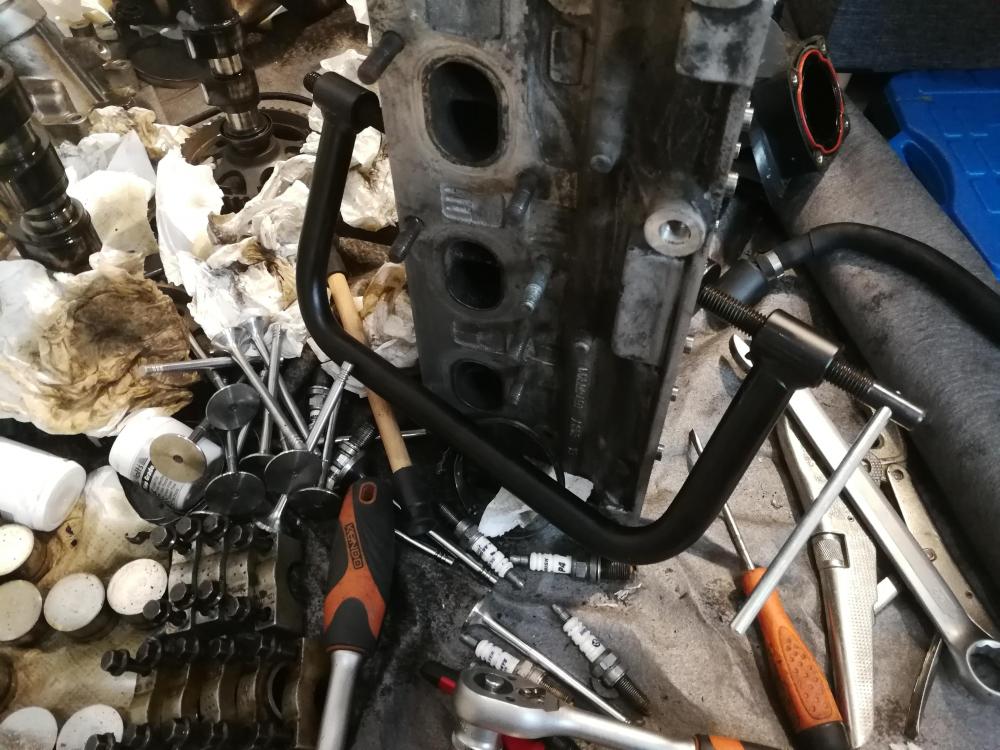 Je vient de recevoir la pièce : https://www.manomano.fr/outil-du-mecanicien/compresseur-de-ressorts-de-soupape-boite-de-11-pieces-pour-compresseur-de-ressort-a-soupape-11-pieces-avec-une-mallette-rouge-materiau-acier-c45-5315523?model_id=5315523 Du coup je commence le démontage des arbres à came et des soupapes.