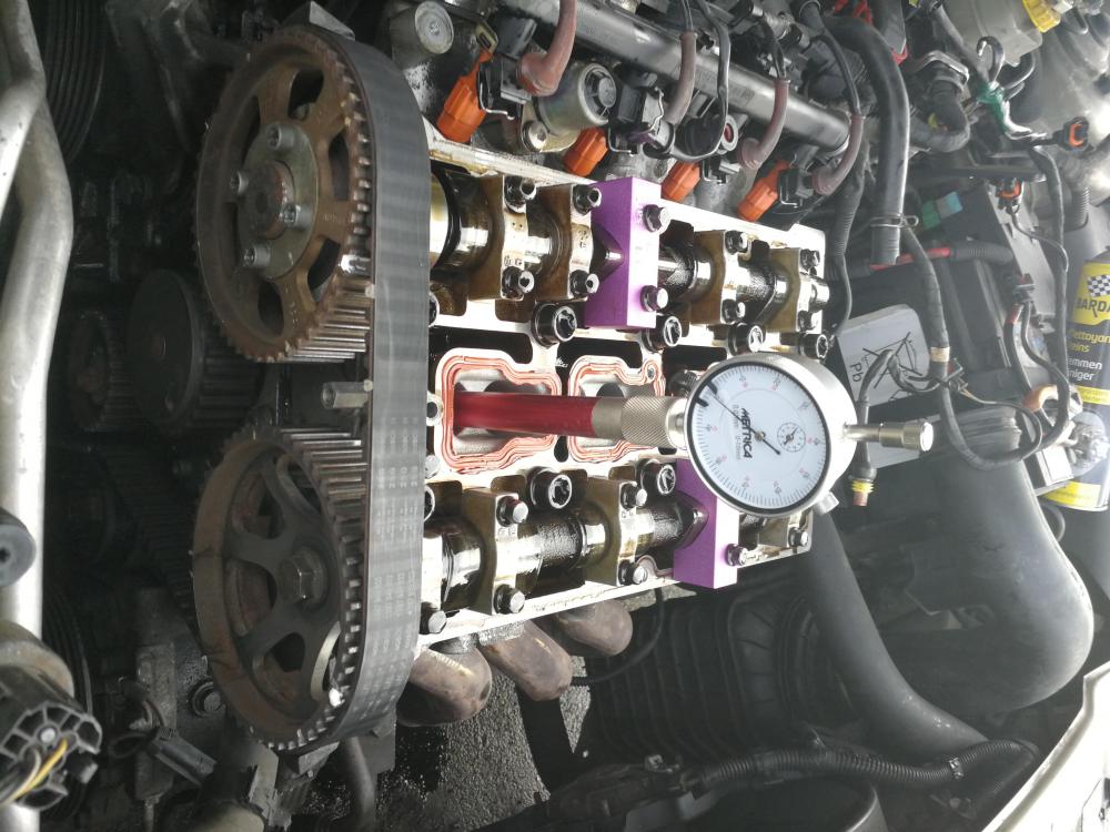 Du coup lesquels ? Pour recaler le moteur à partir de zéro, il faut trouver les PMH du moteur et caler les arbres à came (cale dispo sur internet) Et pour le PMH les outils sont un comparateur a aiguille et une tige/tuyaux qui prolonge le puits de bougie (faut regarder sur internet en tapant outils PMH Alfa Romeo) Ensuite le PMH se trouve sur le cylindre 1, qui est le cylindre côté courroie de distrib Vérifier que les poussoirs des soupapes reste toujours coller à l'arbre à came en tournant à la main Ensuite tester la compression du moteur en allant tranquillement au début, avec la main, pour écouter le bruit des soupapes et si pour vous il n'y a aucun frottements alors testé chaque compression au démarreur avec les bobines et injecteurs débranchés Mais en général casse courroie = soupape tordu ! Donc démontage culasse. Photo joint de l'outil de PMH (point mort haut)