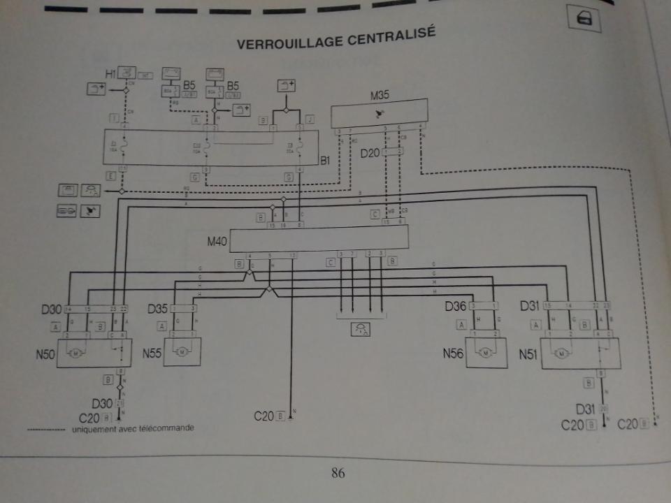 Bonjour, Oublie ce que j'ai dit dans mon post précédent alors, le boitier à l'arrière sert uniquement à recevoir les ondes de la télécommande. (ce que tu appelles centrale RF) Ce qui gère la centralisation est le boitier de service (centrale services) derrière ou en dessous des fusibles habitacle (en dessous à gauche du volant). L'antidémarrage, l'antenne du neiman, la centralisation etc est relié à la centrale services. Tu n'as pas de carte électronique mais je suppose que tu as quand même le transpondeur ? Je suppose ... Sinon elle n'aurait jamais démarré auparavant. Au pire du pire, il y a des kits à vendre avec barillet, clefs, ecu etc. Ce qui est embêtant c'est que généralement, ils ne fournissent pas les barillets des deux portes avant et donc d'avoir deux jeux de clefs différents. Vérifie ton antenne neiman, rapproche la le plus possible de la clef, vérifier son cablage et les connectiques de la centrale (oxydation, mauvais contacts ?). Je te laisse le schéma de la centralisation si ça peut t'avancer dans tes recherches :
