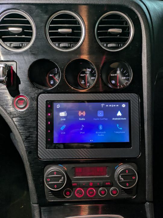 - une fois ici, il va falloir faire une entretoise pour faire ressortir le poste à fleur de console. La meilleure solution étant de la faire en impression 3d, j'ai donc fait appel à un pro, je lui ai emmené la console centrale et le nouveau poste pour qu'il prenne les côtes, il m'a réalisé l'entretoise et l'habillage de contour du poste en imitation carbone.