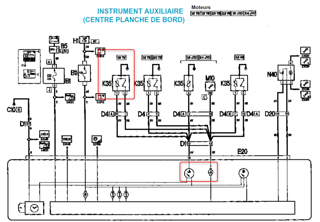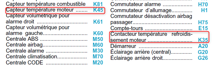 Bonjour, Voila j'ai un souci avec une 156 que je viens d'acheter, c'est un 1.6 TS de 2000 avec 106 000km. La température moteur monte au tableau de bord sans que le ventilateur ne se met en marche. Je l'ai vu monter jusque la graduation entre le 90 et 130°. Je dois avouer que cela m'inquiète un peu !! J'ai déjà fait pas mal d'essai mais je suis a court d'inspiration 😕 - Tout d'abord le ventilateur fonctionne : Brancher directement sur la batterie (avec un fusible au cas ou,) il démarre. - Ensuite j'ai fait des tests sur le relai vitesse 2 : Le J31 : J'ai placé la borne 30 de cette prise (en enlevant le relai) à la masse (pour simuler la commande du relai. Le ventilateur démarre bien !! - Ensuite j'ai tester le relai en lui même : Environ 75Ohms sur les bornes de commande, en y mettant un 12V entre ces bornes, on entend bien un "tic" et j'ai une continuité entre les borne de puissance donc pour moi c'est OK ! C'est à partir de maintenant que cela devient "drôle" - Aussi bien dans le Elearn que sur Eper et le RTA, cela parle de 2 sondes de température, une à 3 poles sur le thermostat qui gère l'injection et le ventilateur et une seconde à 2 poles sur la culasse directement connecter à la jauge au tableau de bord et l'indicateur de surchauffe : - Capture Elarn du montage : - Confirmation Eper : Référence de la sonde à 2 pôles 7762300 (avec un déclenchement du voyant de surchauffe à 120°C) Caractéristique de la sonde : La sonde du thermostat est dans la section 10226 : Référence de la sonde 3 poles 46474712 qui est en faite une double sonde (peut être par sécurité) De plus en regardant les schéma électrique de la RTA, on voit bien qu'il y a 2 sondes distincts qui servent à ces 2 fonctions : Gestion moteur et ventilation : Affichage de la température et témoin de surchauffe : Les 2 composants /sondes en question : Ca s'était pour la théorie ! Maintenant dans la pratique ca se corse ... Voila une photo de mon montage : Il ne me manquerait pas comme une sonde ou il y a le bouchon ?? Je m'y perd complétement, j'y comprend plus rien ... Comment est donc remonté cette température au tableau de bord ?? De plus j'ai entendu dire que si on débranche la sonde de gestion moteur le ventilateur est activé par sécurité, j'ai fait le test et hormis un voyant de défaut d'injection au tableau de bord, le ventilateur n'a pas démarré 😕 Mon dernier test a été de brancher mon outil de diag (un autel) pour voir la température dans le calculateur et la c'est le drame !! Il me remonte un -30.4Deg./Cent ..... WTF c'est quoi cette valeur !! Le moteur n'était pas chaud mais pas gelé non plus, à l'arrêt depuis environ 2 bonne heures .... Et quand j'ai démarré, les valeur sont devenu n'importe quoi.... J'y comprend plus rien, je suis a 2 doigt de péter un câble ^^ Quelqu'un pourrait me filer un coup de main ou me donner un piste.... J'ai plus d'idée la .... Par avance merci et désolé pour le pâté lol Bonne soirée, Ludo