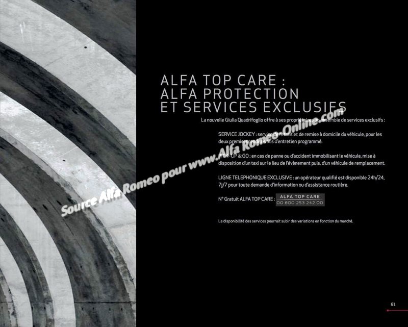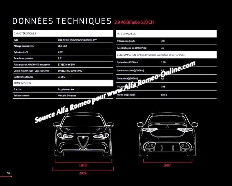 MODÈLE ALFA GIULIA QUADRIFOGLIO VERDE Modèles disponibles de 2016 à aujourd'hui: Essence : Bloc 2.9 alu (510 ch) 6 cylindres en V à 90° puissance maxi à trs.min : 510ch à 6500 tours/minutes couple maxi à trs.min : 600 Nm à 2250 tours/minutes associé à BVM6 ou BVA8 de type ZF Propulsion arrière Poids : 1580 kilos 0 à 100 : 3,9 secondes Finitions disponibles : Quadrifoglio Verde Jantes disponibles : 19p Design Leggera 19p Design Quadrifoglio Couleurs disponibles : Rouge Competizione Blanc Trofeo Bleu MonteCarlo Gris Silverstone Noir Vulcano Gris Vesuvio Rouge Alfa Prix d'appel 1er Janvier 2017: 79 000 euros. fichiers associés : Brochure France Brochure QV -