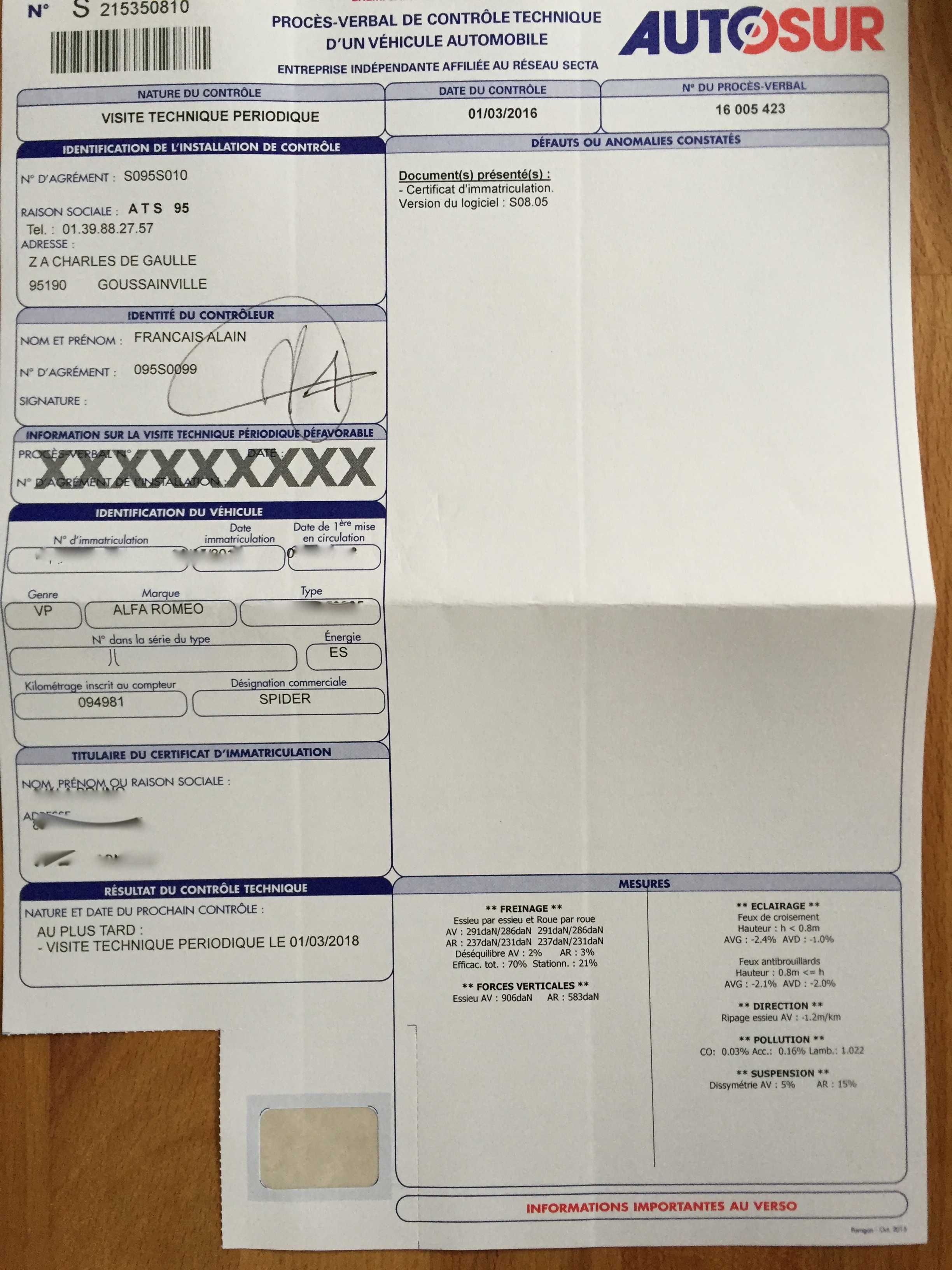 alfisto Posté(e) le 1 Mars 2016 Auteur Signaler Posté(e) le 1 Mars 2016 Je rigole tout seul chez moi de tes conneries mais c'est pas faut Ce matin passage du CT du spider et roulement de tambour ……………..