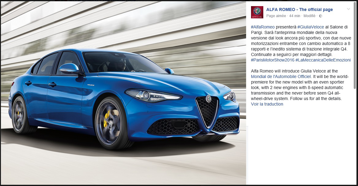 Oliv'BZH Posté(e) le 20 Septembre 2016 Signaler Posté(e) le 20 Septembre 2016 La Giulia Veloce est annoncée en première mondiale au Mondiale de l'Auto de Paris dans quelques jours. Au programme, 2 nouveaux moteurs (non précisés pour l'instant), boîte auto 8 vitesses, et 4 roues motrices Q4.