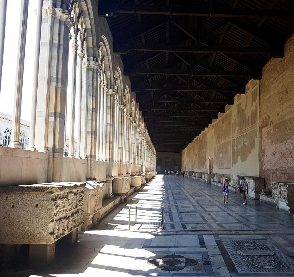 Lodein Posté(e) le 27 Août 2018 Auteur Signaler Posté(e) le 27 Août 2018 ...Suite Nous terminons par la visite du Camposanto qui est un cimetière monumental. C'est un cloitre commencé en 1278 et terminé seulement en 1464 autour de terre sacrée prélevée au mont Golgotha. Avec le Baptistère au fond Il renferme les tombes des Pisans célèbres ainsi que celles d'empereurs et personnages importants avec des tombes assez récentes comme celle de Enzo Carli Nous y trouvons aussi des sarcophages Romains et Etrusques On y trouve aussi les reliques de la Cathédrale. Ces reliques comprennent entre autre les restes de onze des douze apôtres, deux fragments de la vraie croix, une épine de la couronne d'épines du Christ et un petit fragment de la robe de la Vierge Marie Nous y trouvons aussi des statues comme celle du célèbre mathématicien Pisan Leonardo Fibonacci Les mur extérieurs sont décorés de Fresques qui ont malheureusement été abimées par un fragment d'une bombe alliés le 27 juillet 1944 qui a déclenché un incendie. Ces Fresques ont été réalisées entre 1360 et le XVIIème siècles et sont l’œuvre de Francesco Traini, Buonamico Buffalmacco, Benozzo Gozzoli, Andréa Di Bonaiuto, Antonio Veneziano, Spinello Aretino et Taddeo Gaddi. Elles sont depuis 1945 en cours de restauration A suivre... Lodein