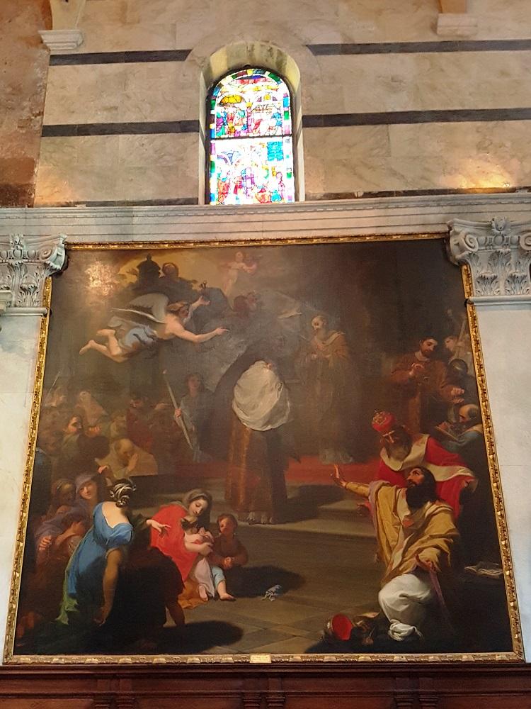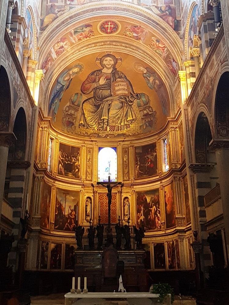 Lodein Posté(e) le 27 Août 2018 Auteur Signaler Posté(e) le 27 Août 2018 (modifié) ...Suite Nous pénétrons dans la cathédrale par de monumentales portes en Bronze datant de 1602 puisque la cathédrale fut la proie à un incendie en 1595 : La grande mosaïque de l’abside représentant le Christ en majesté entouré par la Vierge et de Saint Jean a été achevée par Cinabue en 1302, et a miraculeusement survécu à l’incendie de 1595. Une autre œuvre majeure de la Cathédrale qui a aussi survécu à l'incendie est la Chair de Giovani Pisano (1302-1311) Nous trouvons de superbes plafonds à caisson du XVIIème siècle aux armoiries des Médicis : De belles peintures Des fresques La Cathédrale abrite entre autre la tombe de San Ranieri (Saint Rainier de Pise) Nous trouvons de superbes marqueteries Les bancs sont gravés aux noms de donateurs Nous finissons cette visite par la superbe fresque du dôme A suivre... Lodein Modifié le 27 Août 2018 par Lodein