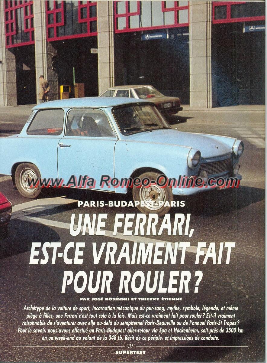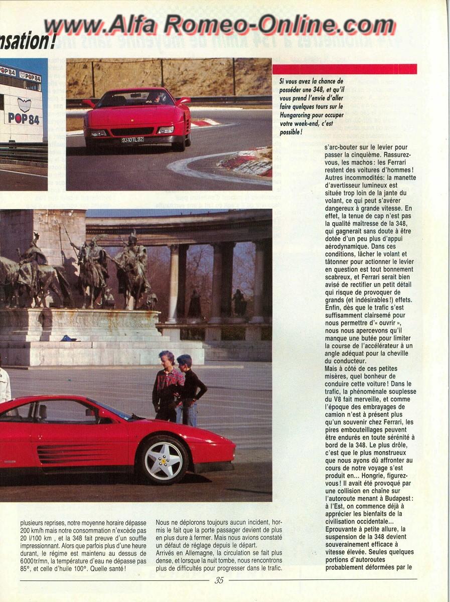 Lodein Posté(e) le 20 Octobre 2018 Signaler Posté(e) le 20 Octobre 2018 Cela faisait longtemps que je ne vous avais rien mis dans cette rubrique Voici un article du Sport Auto N°339 d'avril 1990 relatant 3500 km en un week end au volant de la Ferrari 348 TB. Je sais, ce n'est pas une Alfa Romeo , mais c'est bien quand même !!! De plus j'adore ce genre d'article, bonne lecture (comme toujours vous pouvez cliquez sur les photos pour faciliter la lecture) Lodein
