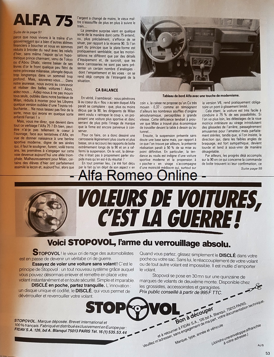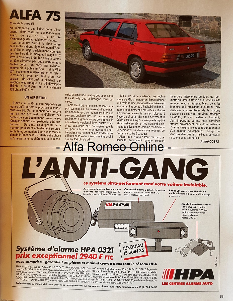 Lodein Posté(e) le 24 Janvier 2021 Signaler Posté(e) le 24 Janvier 2021 Vous trouverez dans ce numéro du 15 mai 1985 de l'Auto Journal une prise de contact avec la nouvelle Alfa Romeo 75 Bonne lecture Lodein